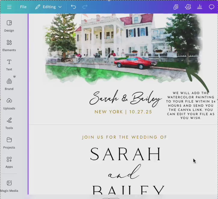 🧡 This is a do-it-yourself Canva Template, the artwork for the Wedding Invitation Template is mine to watercolor. the text parts need to be edited by you.